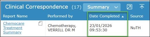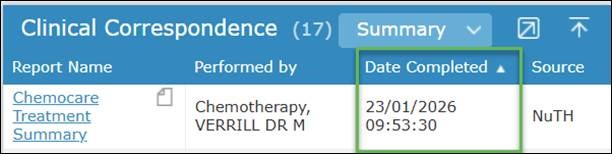 The ‘Date Completed’ on the widget is the date which the document was created. When the treatment is updated on the ChemoCare system, an updated version of the document will appear in GNCR. However, the ‘Date Completed’ section will not change.